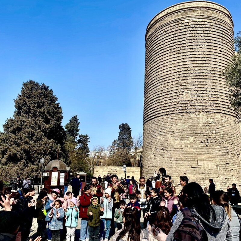 Artistic performances during Novruz celebrations in front of the Maiden Tower (12th century) in Icheri Sheher (Old City). Baku, March 2024.