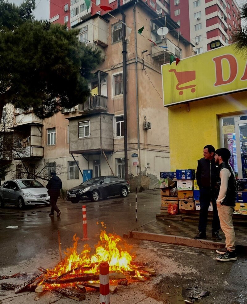A bonfire in a Baku neighbourhood on the fourth Tuesday before Novruz celebrations. Baku, March 2024.
